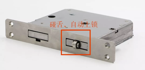 ? ? ? ?這種鎖體類似于王力的鎖舌自彈鎖體,在鎖體上有一個反鎖觸發裝置(如下圖),關門時只要碰舌與門觸碰,主鎖舌便會自動彈出,最終達到自動上鎖的目的。但嚴格意義上講,這種智能鎖只能算是狹義上的“全自動智能鎖”,因為開門時驗證指紋之后還需下壓把手方能開門,并未做到真正的全自動。